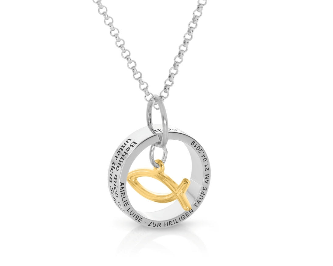 Der Ring kann außen und auf den schmalen Rand (Sichtkante) beschriftet werden. Für eine Gravur der Außenseite stehen Ihnen insgesamt max. 125 Zeichen inkl. Leerzeichen zur Verfügung. Auf der schmalen Sichtkante des Ringes können Ihre Wünsche mit max. 70 Zeichen inkl. Leerzeichen graviert werden In dem Ring hängt ein wunderschöner Fisch/ Ichthys Anhänger aus hochwertig vergoldetem 925 Sterling Silber.
