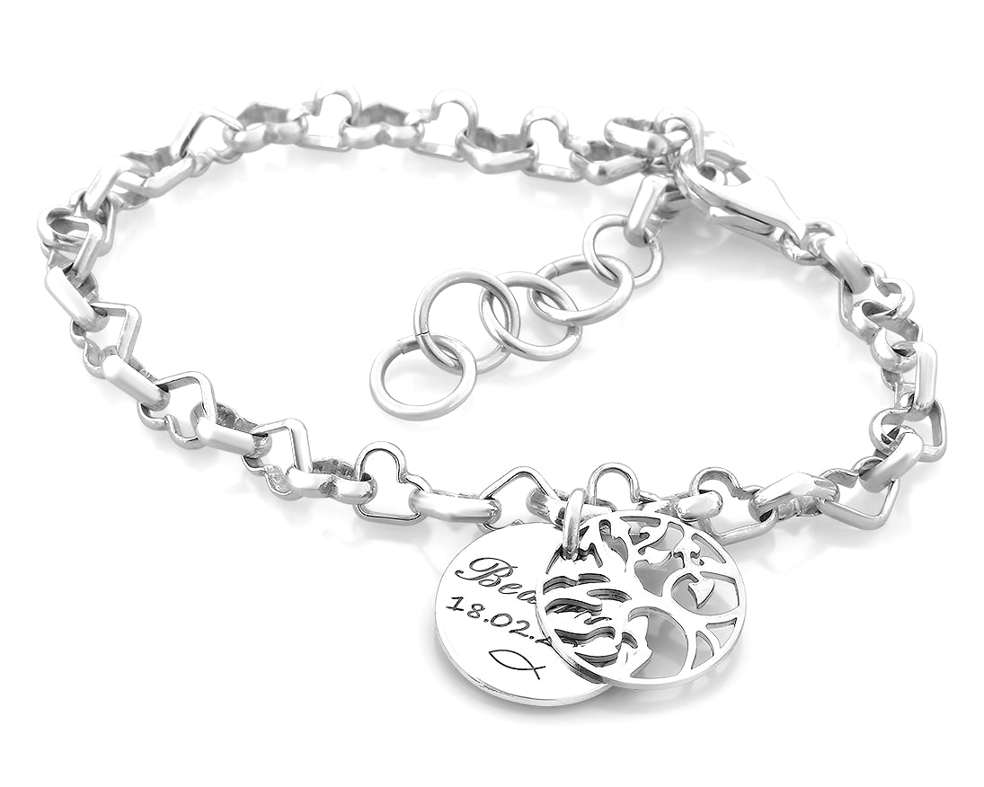 LEBENSBAUM SCHMUCK MIT GRAVUR, SILBERARMBAND MIT HERZEN
