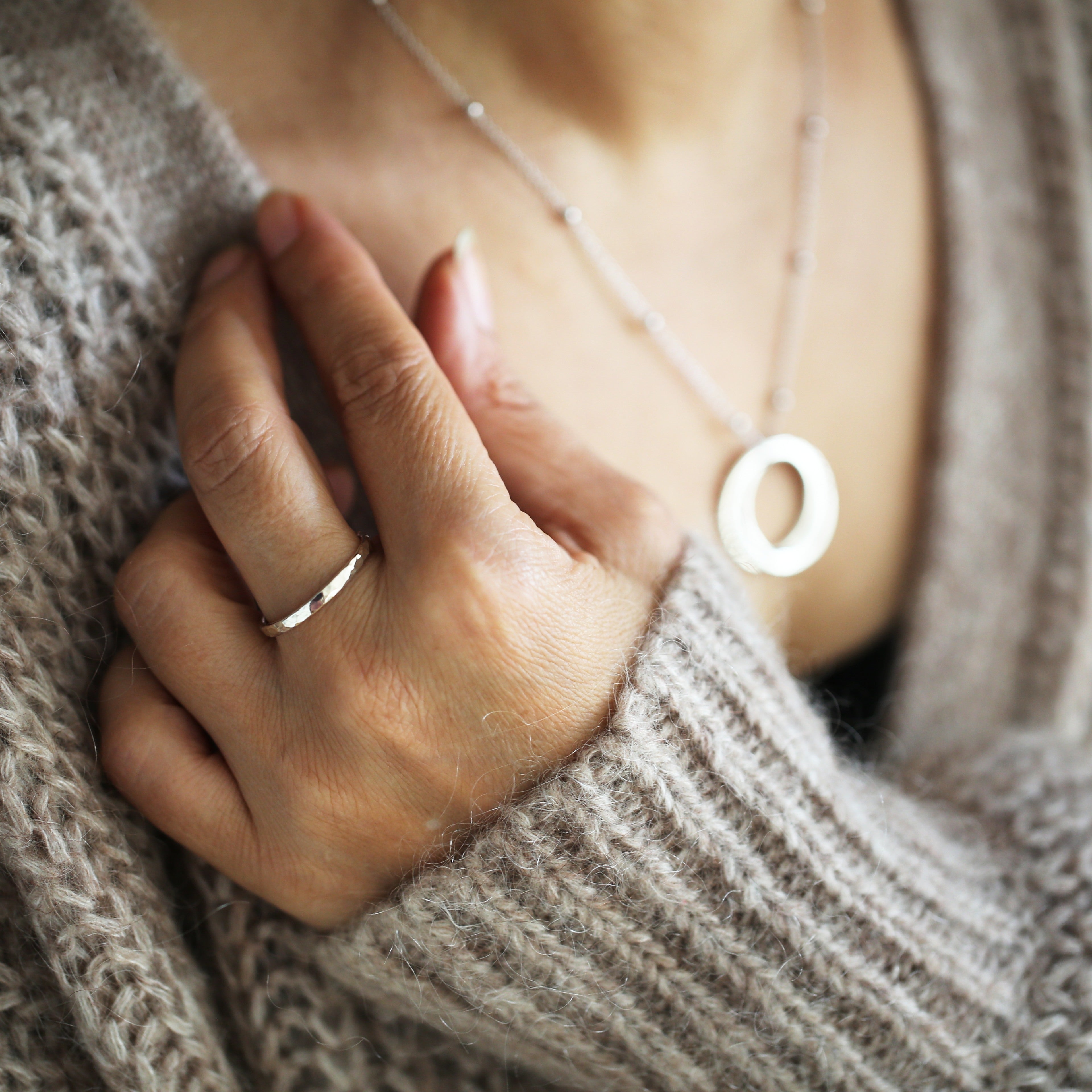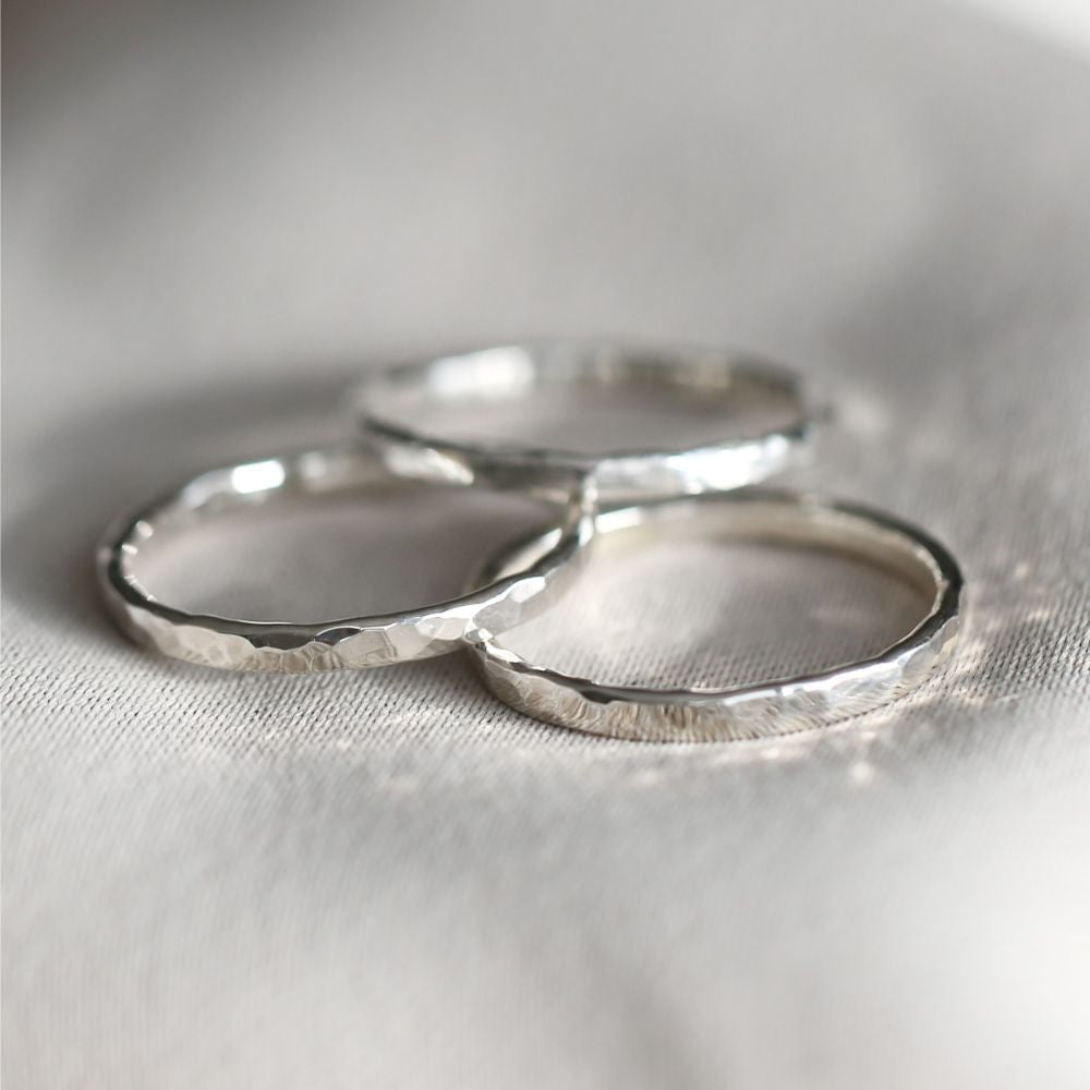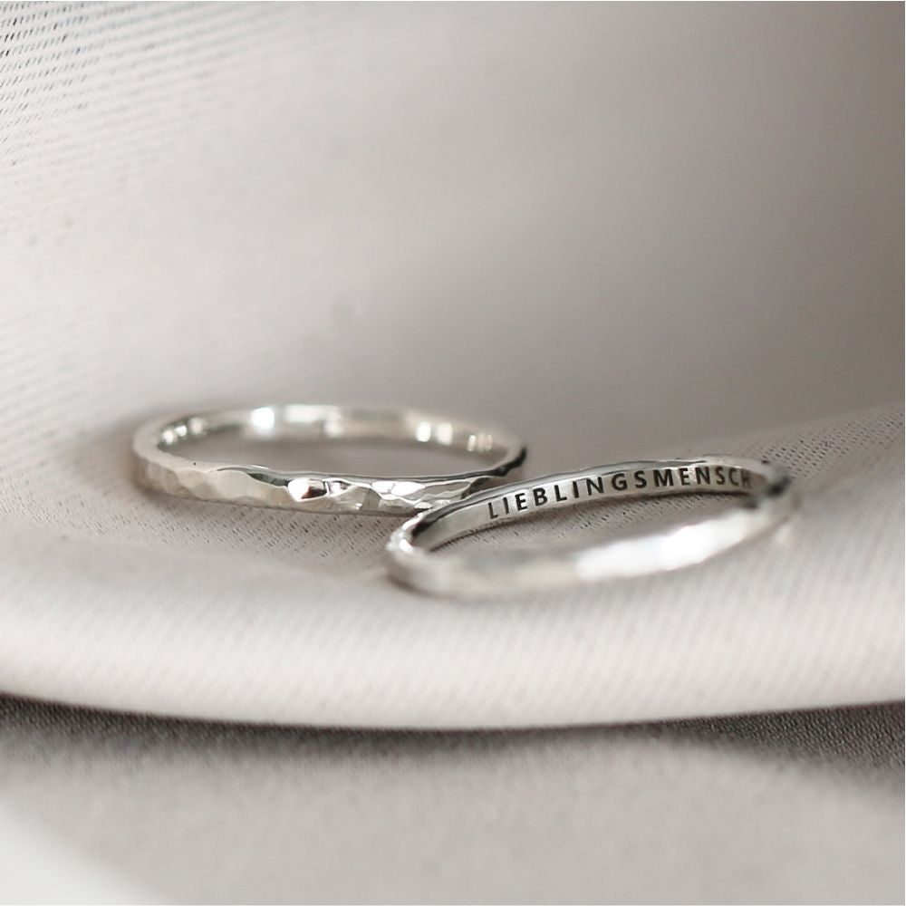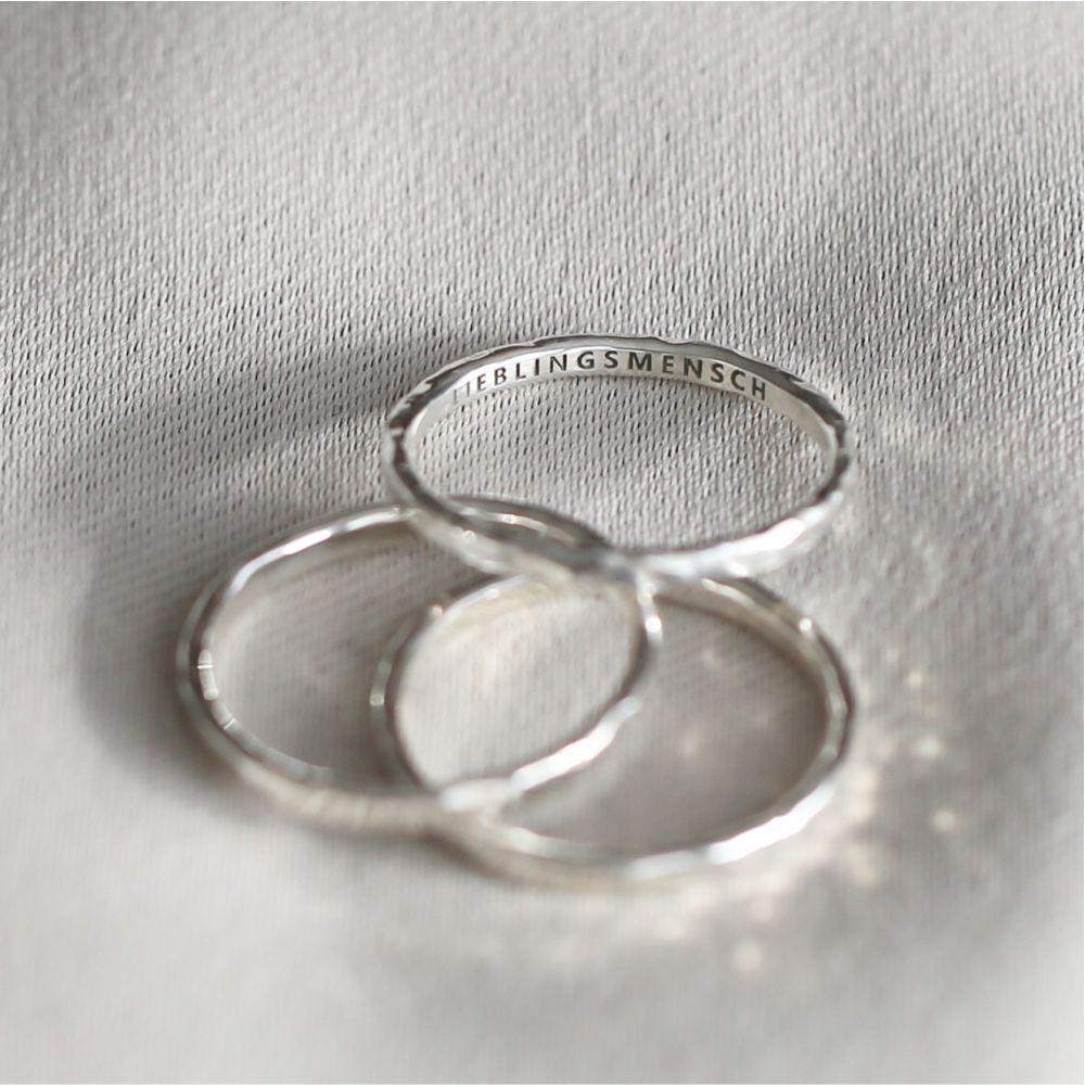 Der Fingerring ist schmal und kann toll mit anderen Ringen kombiniert werden. Die Oberfläche hat eine gehämmerte Struktur und glänzt schön dezent am Finger.