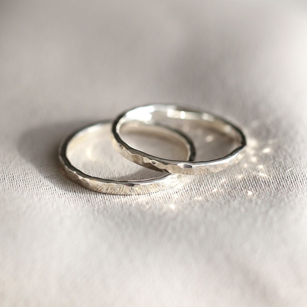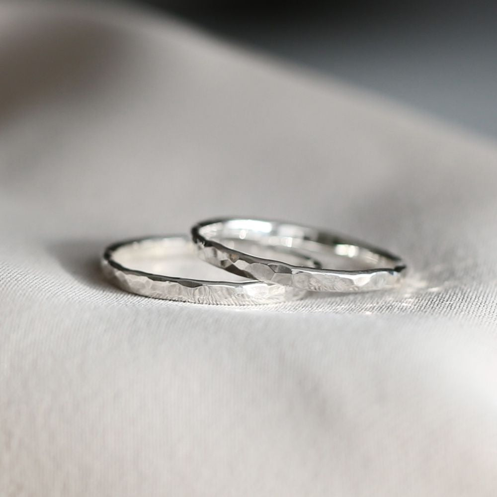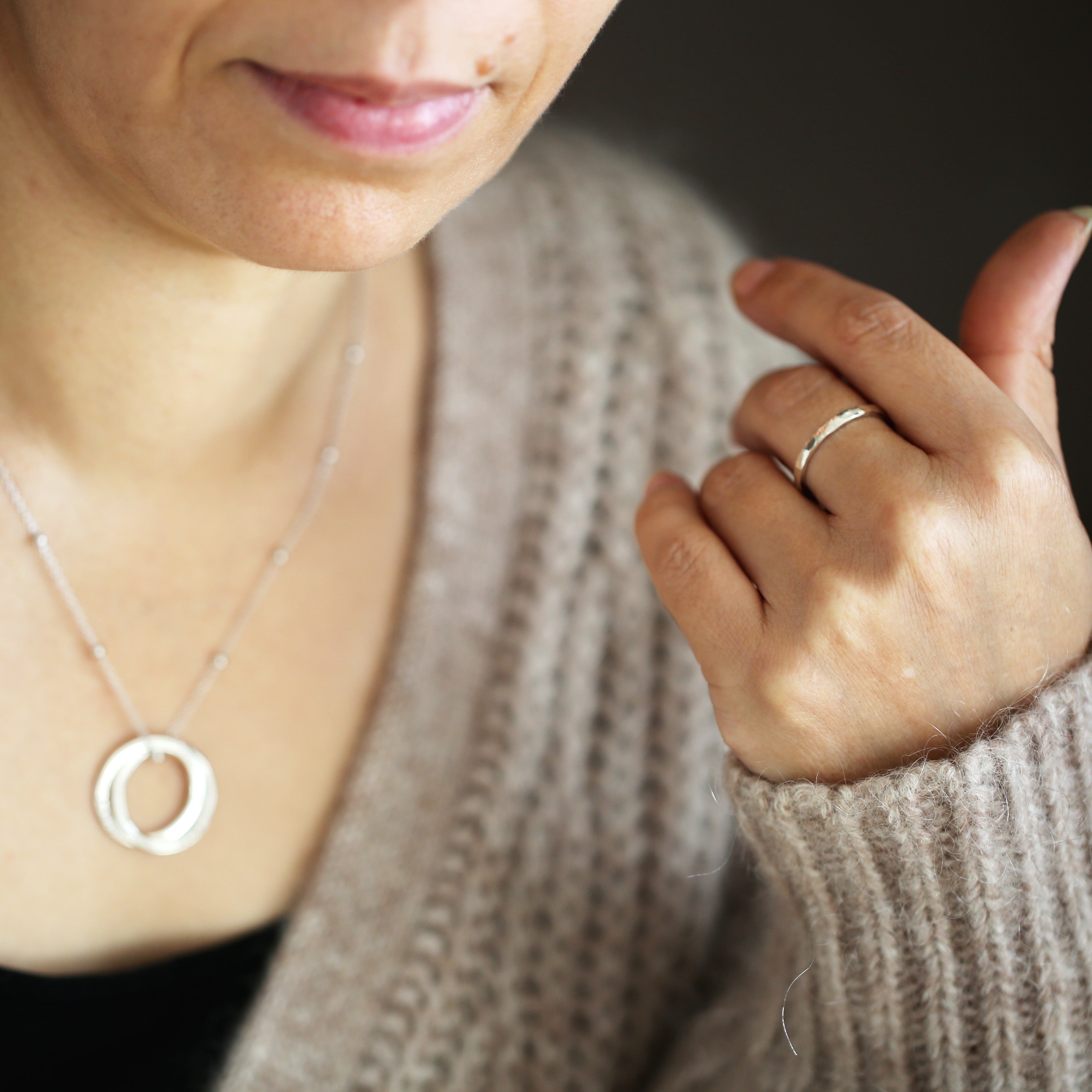 Der Fingerring ist schmal und kann toll mit anderen Ringen kombiniert werden. Die Oberfläche hat eine gehämmerte Struktur und glänzt schön dezent am Finger.